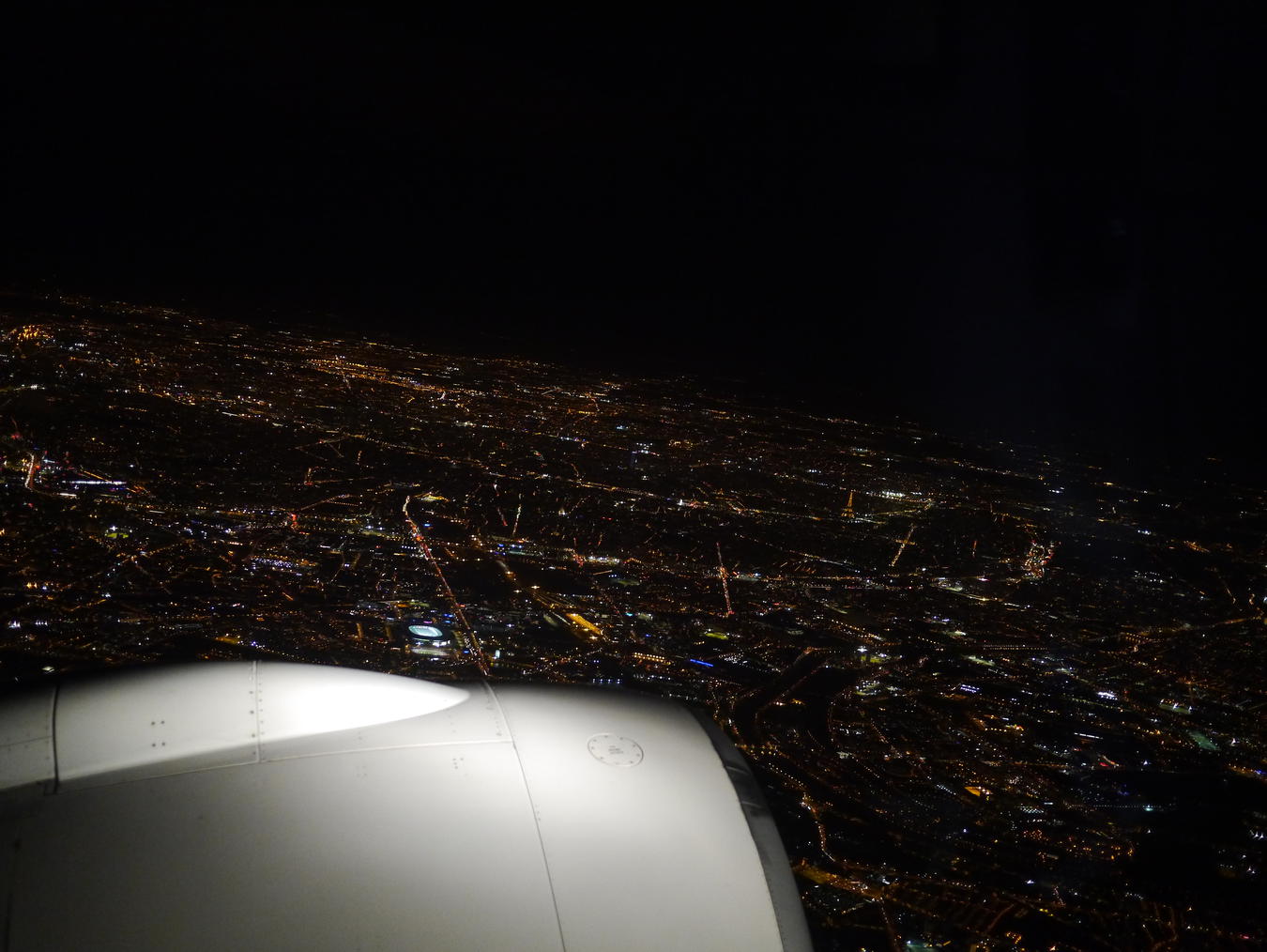 After switching terminals, doing quite a bit of reading, eating an outrageous 40 euro lunch and an equally overpriced snack, we finally boarded the plane for Phnom Penh via Ho Chi Minh City at 7:20 pm on Tuesday. I do have to admit that it's a pretty nice view when you're flying out of Paris after sunset, as seen at right. (Hint: instead of playing "where's Waldo" you need to play "where's the Eiffel tower" with this picture of the City of Light. And unless you have amazing vision, you'll probably need to click on it to get the larger version.) The true test of how much jet lag would affect us would come when we arrived in Cambodia after that longer flight.
