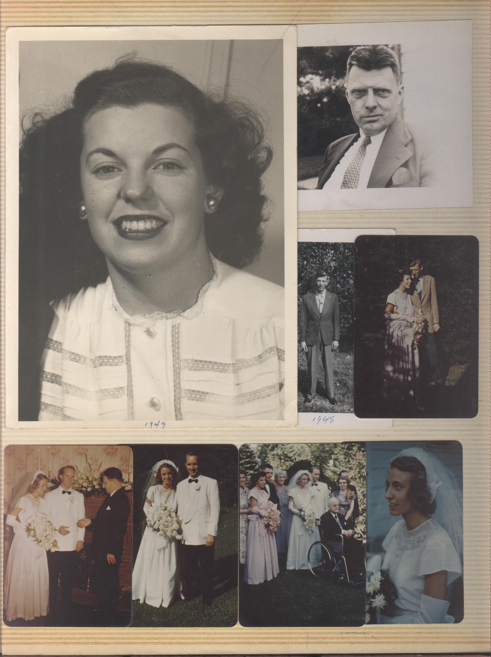 Lower photos: 1) Wedding photo of Carol and Stan Wallace at fireplace in house in Whitestone with Pastor Charles Pont officiating, 2) Carol and Stan alone, 3) Wedding party in back yard, 4) Just the bride