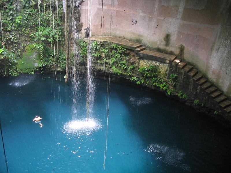 It wasn't all work, though. They did get to some archaeological sites such as Chichen Itza, which included the Mayan pyramid shown at right, and to some natural wonders as well, such as the cenote (sinkhole connecting to underground rivers) at left. Katherine is graduating next year, and is considering a number of job possibilities (Her degree is in Human Rights Studies with minors in Spanish and Linguistics.)