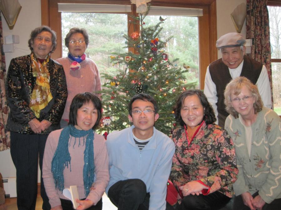 Laura did more volunteering than working over the past year. One activity she has been doing is teaching ESL in Bedford along with another teacher. Shown is her class at our house where they talked about the meaning of Christmas. Laura also brought out some Chinese "ice-breaker" cards we recently received from our friends Ed and Janelle, and the students got a kick out of those.