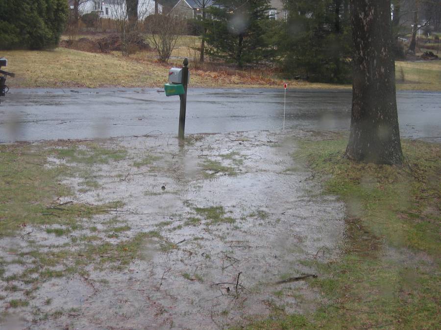 A couple of months later Massachusetts had some monsoon rains for quite a few days. Our yard was completely flooded, as you can see in the picture at above right, and we did get an inch or two of water in our lower-level basement room. That was nothing compared to what our neighbors had. When you look outside and see a city truck working on the storm sewer, it's not a good sign. They got 18 inches into their basement due to the storm sewer failure. If the picture looks a little fuzzy, that's because it was raining too hard to walk outside with the camera!