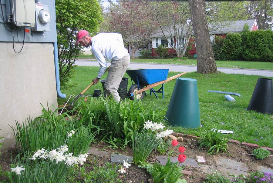 You might recall that last year we installed a rain barrel. The result of that was that it rained all summer and we didn't really make much use of the barrel. This year it didn't rain and we did conserve water using the barrel. To maintain our green credentials this year, we installed a compost bin (a gift of the kids to Laura). It took a lot of digging (on the left) but the finished product can be seen on the right. It's a mysterious green cone to passers-by.