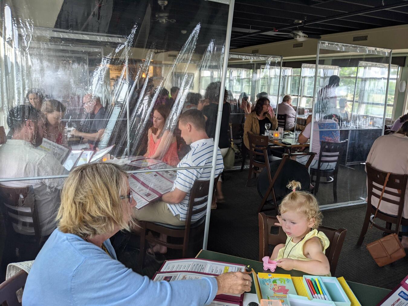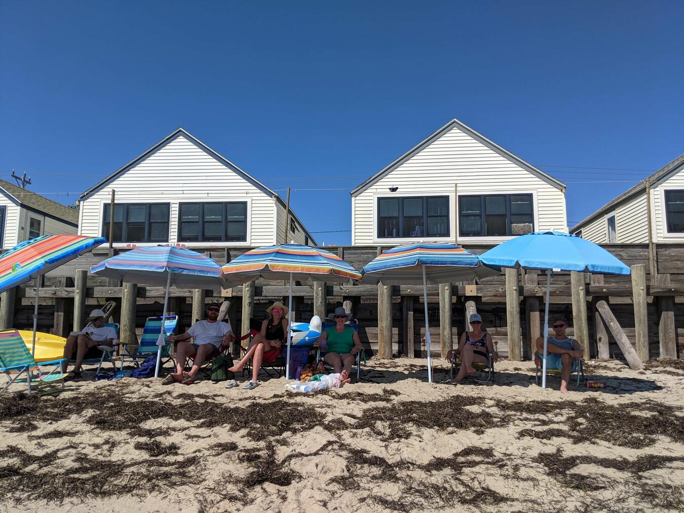 In July we headed out to the Cape for a week with our sisters, my one, and Laura's two, who met up with cousin Brad down on the Cape, as shown in the left picture. At right is our typical beach scene, social distancing as we practiced it. On our first or second day at the Cape, our waiter at the Mayflower informed us that the Crown and Anchor had been shut down for several days by the board of health due to a major covid outbreak, which made national news. This was the first time that Delta was shown to cause a lot of breakthrough infections. We went about our business in the restaurants. The picture shows our annual trip to the Lobster Pot, with plastic separators between our two booths. We had our window open a crack and the air was coming off the water at about 50 mph, so we exceeded all known standards of ventilation. Amy's granddaughter Hazel was able to move back and forth between the booths and entertain herself; rules never apply to small children.