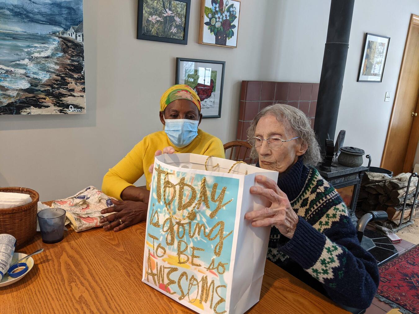 The picture at left shows how things were in January, sitting around the firepit, using the cell phone video monitor to keep an eye on Mom! That's the way things were all around the country as firepits sold at tremendous rates. We started 2021 with a bit of a larger pod than 2020, with Mom and Margaret joining Laura, me, and Matt. We all wore masks (except Mom) when Margaret was here, and ran the ventilation system. I replaced a couple of noisy ventilation fans, and we were on the cutting edge of covid prevention. Mom had her 96th birthday on the 28th, getting some presents early (such as the one shown in the picture, from Margaret), eating cake, and then zooming with friends, kids, and grandkids from all around the country later!