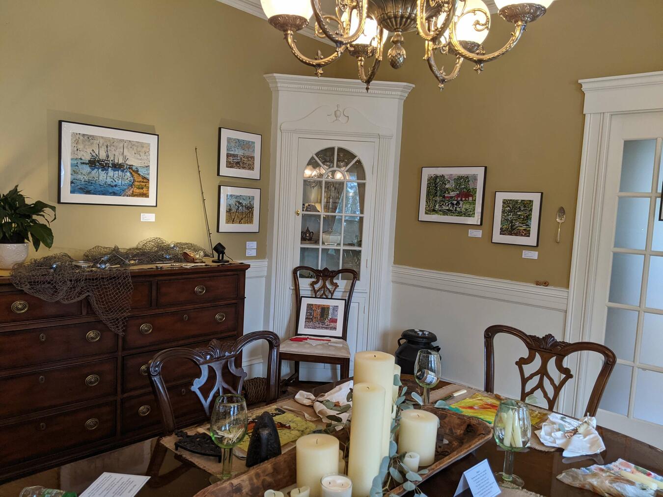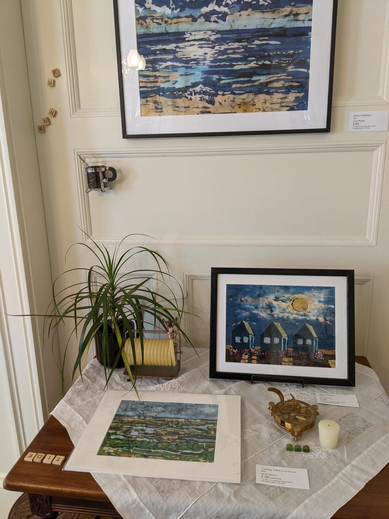 Everyone needs a home hobby during the pandemic, and Laura made quite a few batiks in her basement studio, enough to fill a whole room at Gallery Twist. She went from maybe two to four batiks in a typical show to around thirty in that show, and sold most of them. The picture at left shows her room in the gallery; clicking on it will show another view. Some more of her work can be seen on her artist page at the gallery.