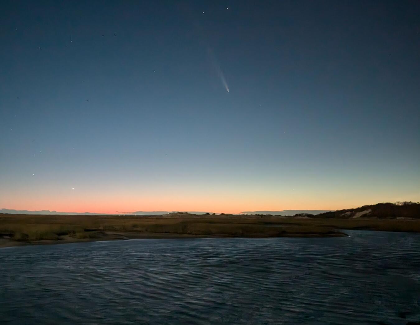 A number of things were happening in the skies in 2024; we didn't travel to see the total solar eclipse so that was partial here, but we did observe the aurora and the comet. In May the solar activity kicked up and we saw the aurora right in Bedford, MA. The picture shows the view from our neighbor's house (thanks, Ruth) looking right over our house. The colors were impressive, but it wasn't quite bright enough to give me any power from the solar panels! Laura and I were at the Cape in October for a few days, just in time to see the comet in a great location near the Provincetown Causeway.
