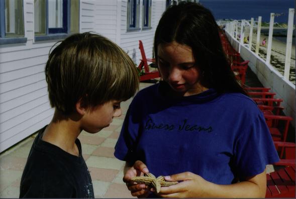 our kids are examining a starfish in front of our cottage.